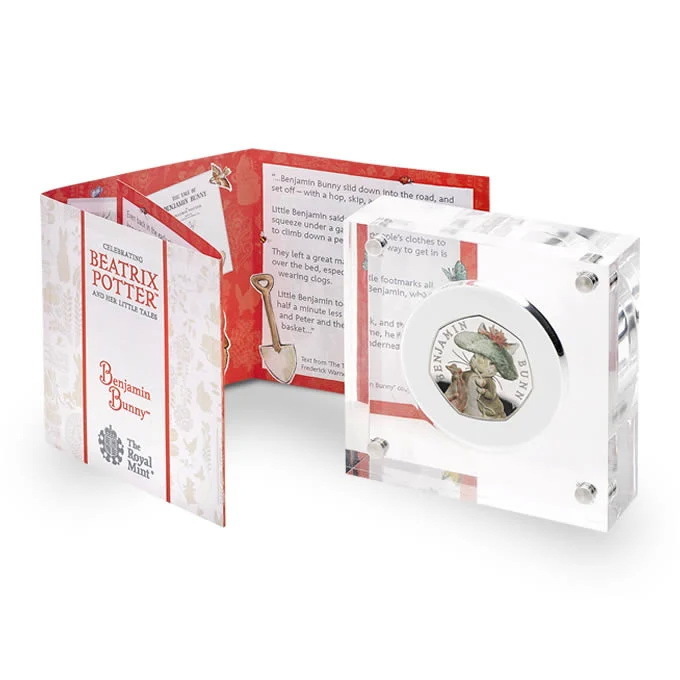 This is the first official United Kingdom coin to feature Benjamin Bunny. The character is instantly recognisable, with his oversized tam-o’-shanter hat and bright red handkerchief highlighted by colour printing and enhanced by the coin’s Proof finish. The coin has been struck in 925 sterling silver and comes in a clear acrylic presentation case with a booklet on Benjamin and his adventures.