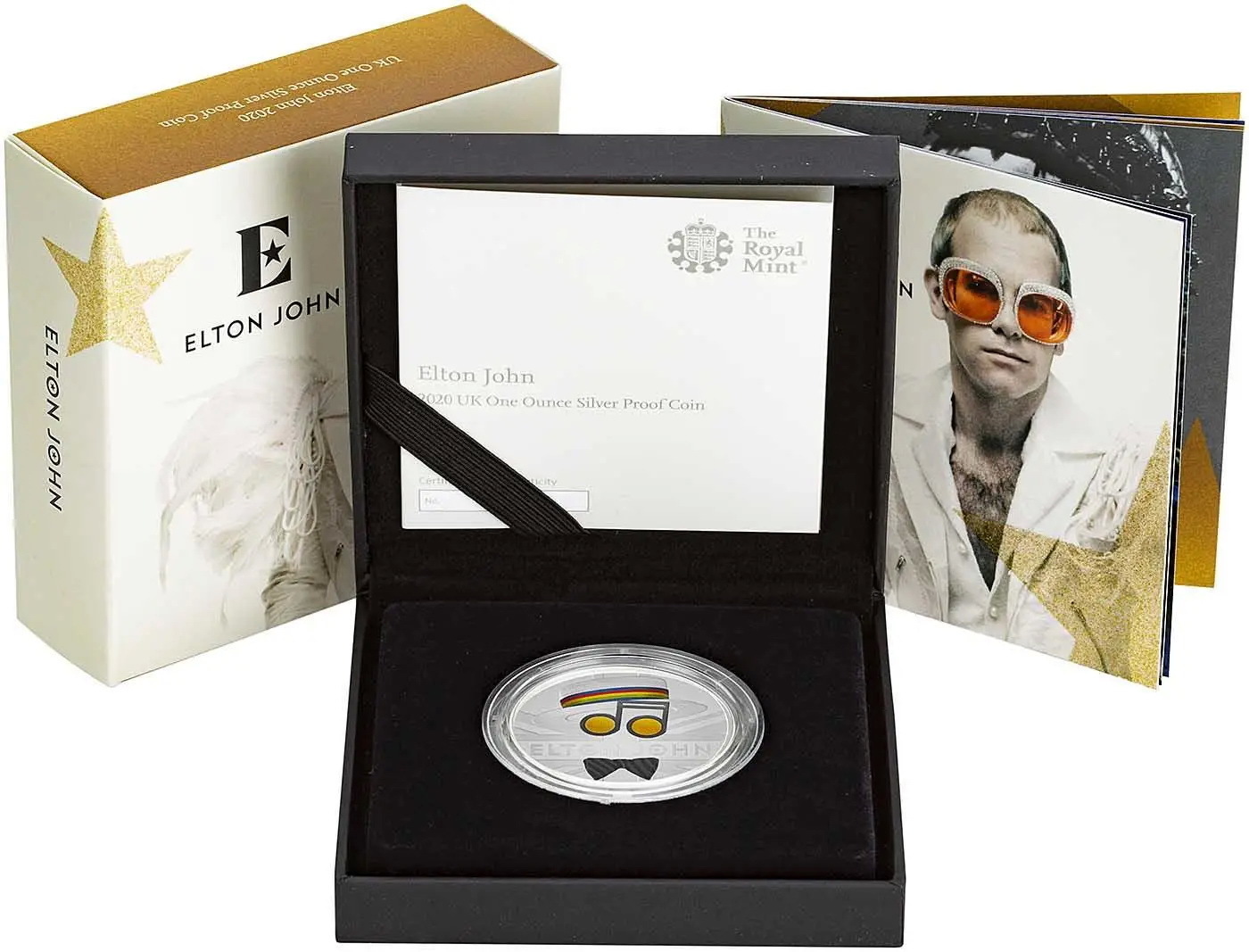Elton John 2020 One Ounce UK £2 Silver Proof Colour Coin : 1oz .999 Silver : Limited Edition : The Royal Mint Limited Edition of only 7500Comes in the original case and box with a numbered COA.