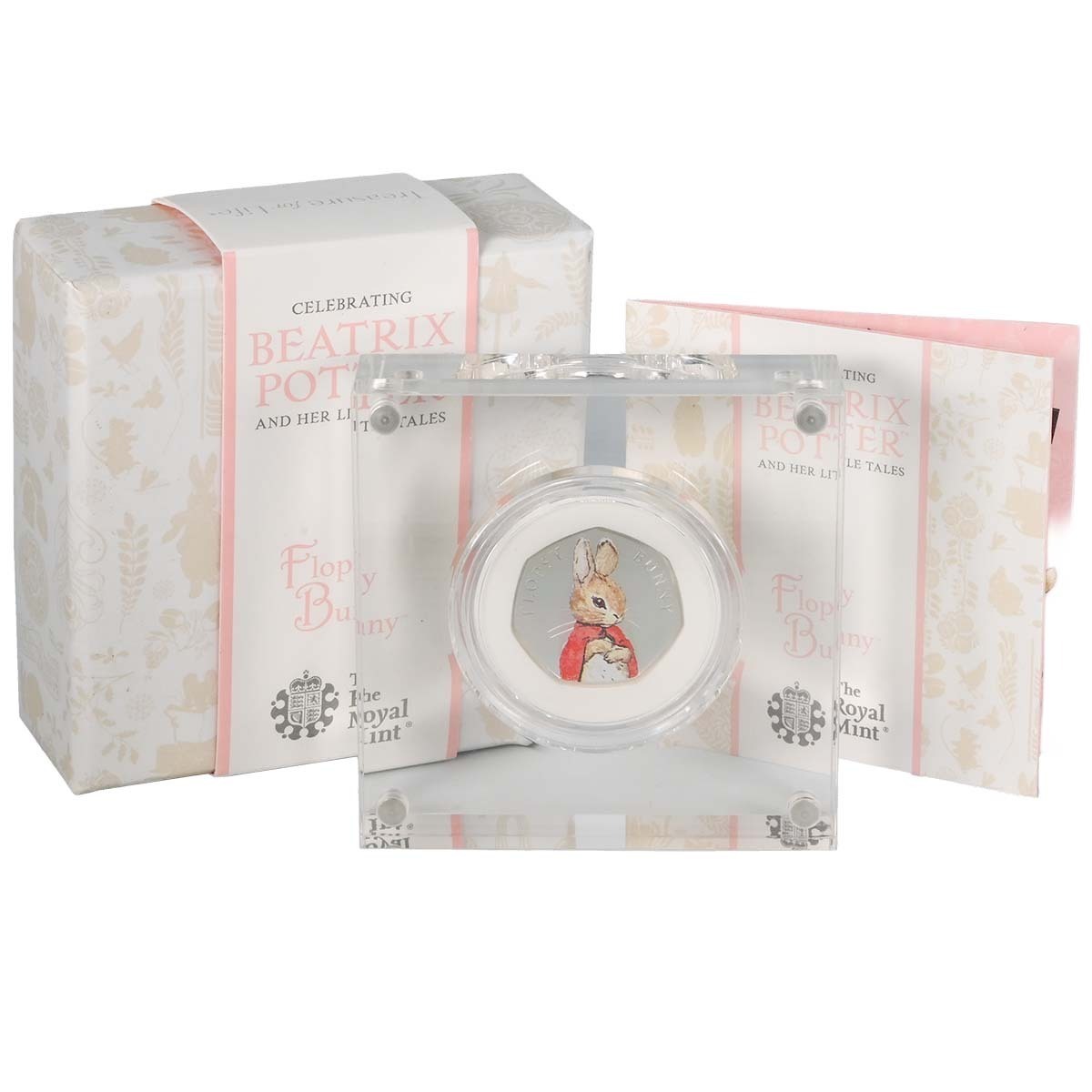 The Flopsy Bunny 50p is one of four Beatrix Potter coin designs issued by The Royal Mint in 2018 and it might be the cutest. It’s inspired by The Tale of the Flopsy Bunnies, first published in 1909: one of Potter’s most popular Little Tales thanks to its beloved rabbit characters. The author and illustrator had previously printed two stories about bunnies and this one uses old characters and introduces new ones including Flopsy Bunny and her six children. Once again Potter’s rabbits evade the clutches of Mr McGregor with a little help from their animal friends. On this Fifty Pence piece Flopsy Bunny is shown wearing a cloak. The text around her head reads ‘FLOPSY BUNNY’. It’s a charming design and one sure to be enjoyed by nostalgic adults and young fans of the classic books. The other side of this coin features Jody Clark’s portrait of Her Majesty the Queen, in use on British coins since 2015. The Royal Mint has been issuing coins featuring Beatrix Potter characters since 2016. This edition is struck in 8.00 grams of .925 sterling silver. It’s finished to finest proof standard with colour printed details, bringing out the detail of the original illustrations. It comes in a printed acrylic display case which protects the coin from little fingers. Also included: the original box and a certificate of authenticity from The Royal Mint.
