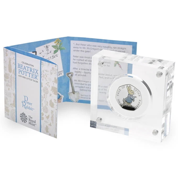 This new 50p coin for 2017 is only the second official United Kingdom coin to feature Peter Rabbit™. It features one of the most famous images of Peter Rabbit™, scampering away, perhaps on the hunt for more mischief. The 925 sterling silver coin features colour printing, highlighting elements like Peter’s signature blue jacket. The coin has been finished to Proof standard and comes in a clear acrylic presentation case.